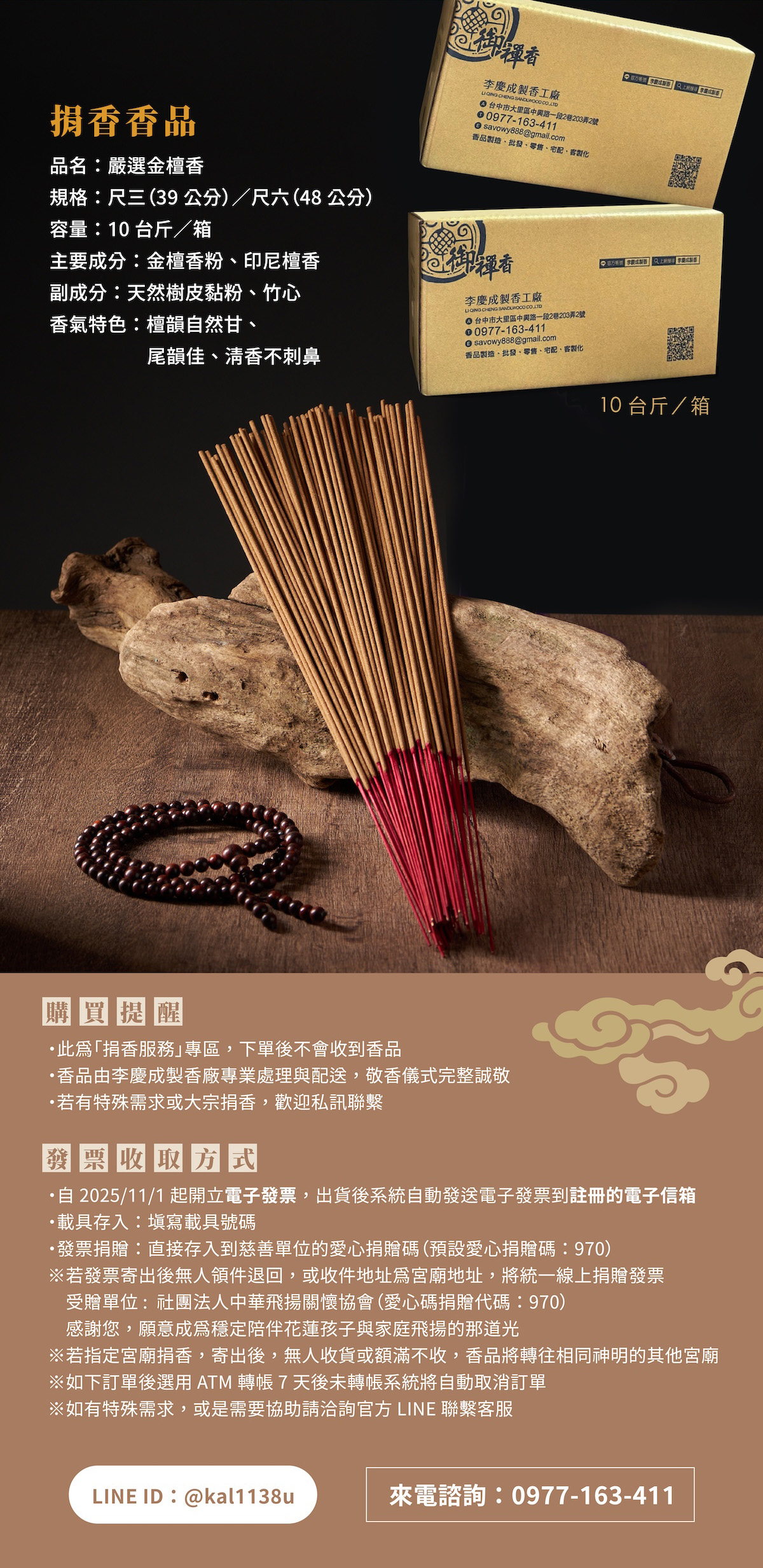 代客捐香品項: 金檀香 10台斤1箱 為一個單位 成分 : 金檀香粉 竹子 樹皮黏粉