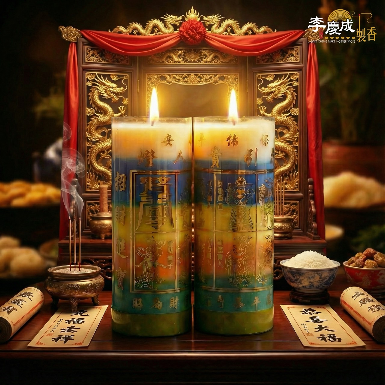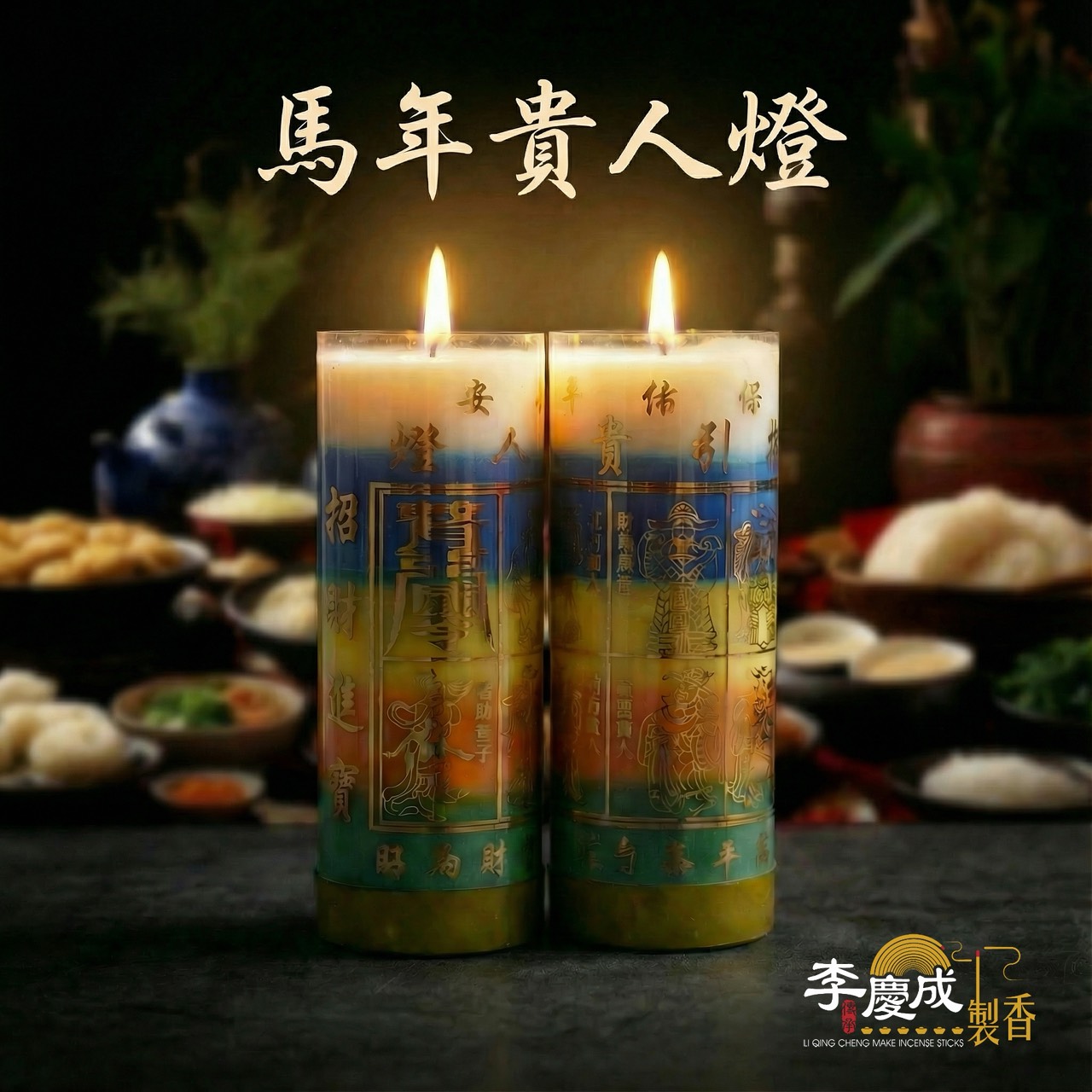 「五行迎貴燈」融合東方哲學,以 白、藍、黃、橙、綠 五色蠟燭層層堆疊,象徵人生不同維度的貴人依序到位、彼此相生。