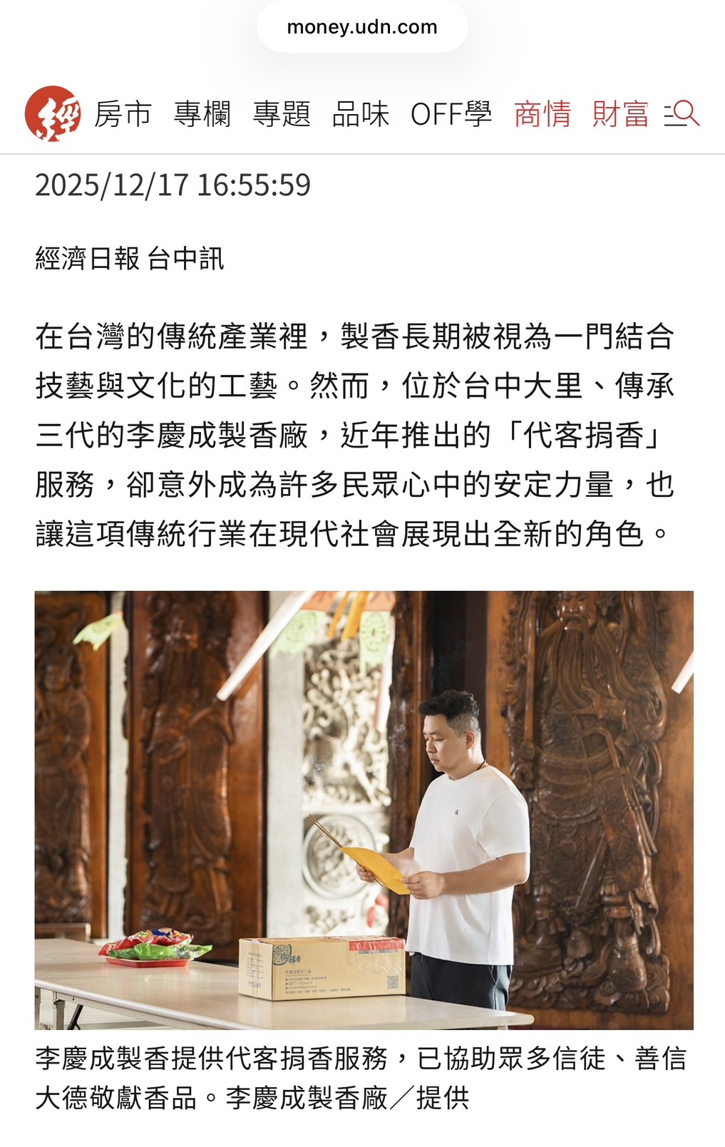 由李慶成製香廠不指定的土地公廟代客捐香,並於尾牙2月3日當天送達
